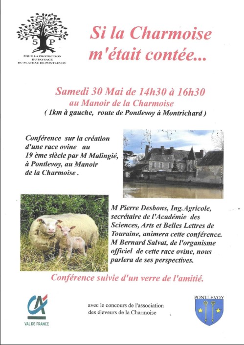 L'association pour la protection des paysages du plateau de Pontlevoy organise, avec le concours de l'association des éleveurs de la race de La Charmoise une conférence sur l'histoire de la race ovine de La Charmoise et son évolution actuelle. Conférence sur la création d’une race ovine au 19ème siècle par M Malingié, à Pontlevoy, au Manoir de la Charmoise.