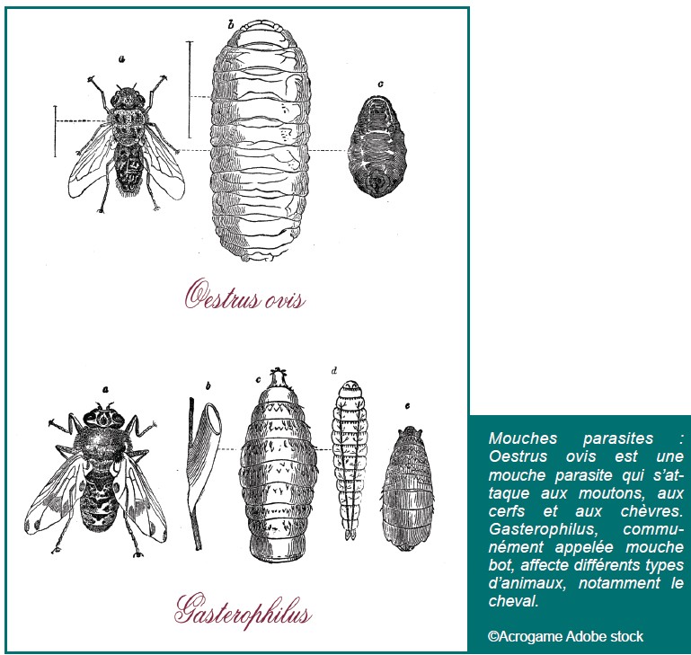 - Oestrus ovis, parasite des petits ruminants avec une préférence pour les ovins, mais pouvant s’attaquer également à d’autres espèces comme les équins, les chiens, voire aux humains.