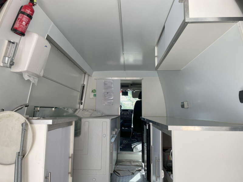 Vitrine réfrigérée avec zone froide de stockage, une armoire réfrigérée 3 portes, des rangements, un lave-mains, lumière Led, branchement sur secteur ou sur batterie, caméra de recul, ouverture latérale pour la vente.